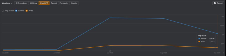 However after we take a look at estimated ChatGPT mentions (September 2025), Airbnb has ~8,636, whereas Vrbo has solely ~1,573. That’s a ratio of ~11:2.